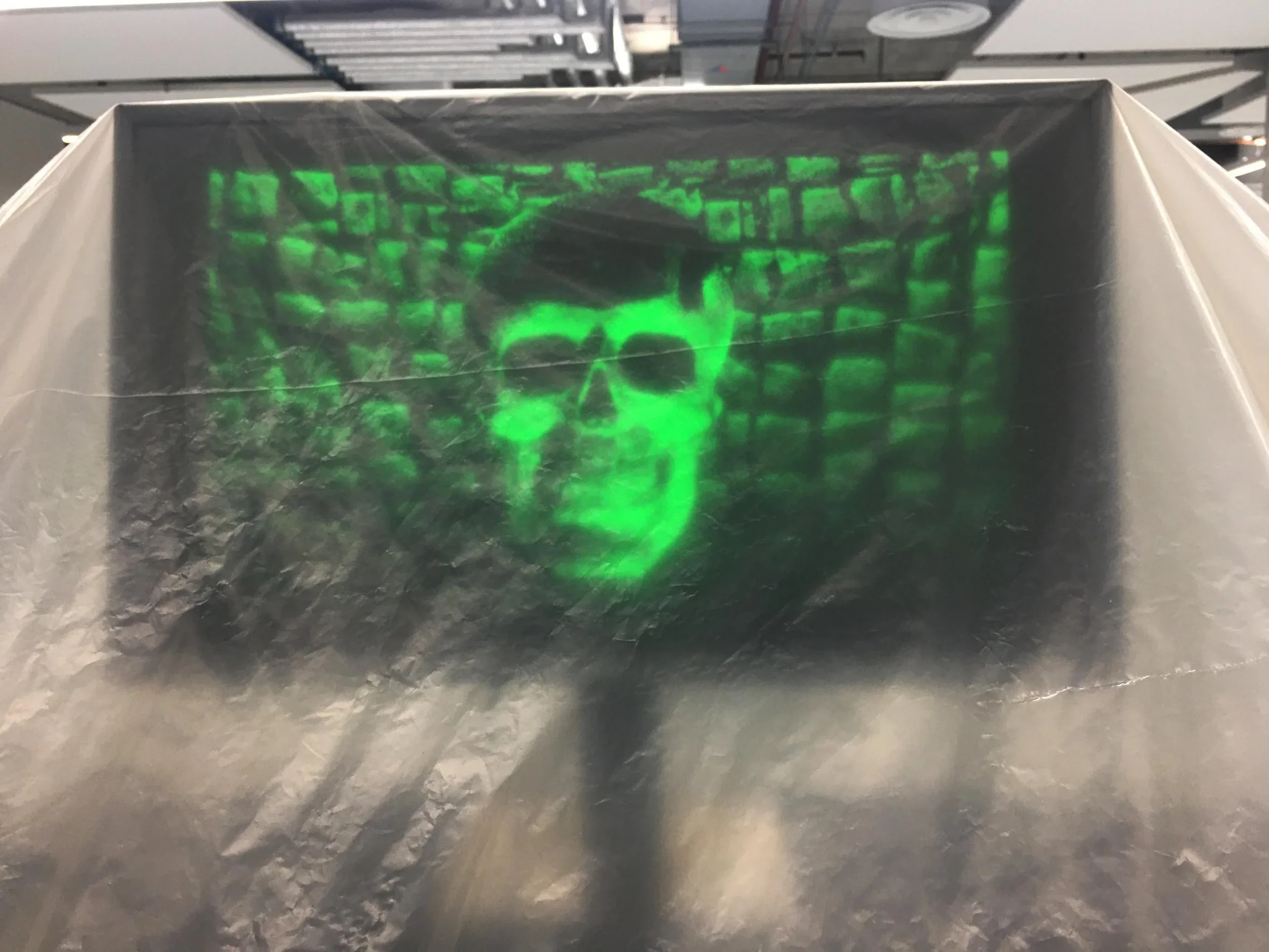 A still frame from the film, showing Beck within the video described above. Here the symbols, both the originals and the 8-bit versions we created are more visible. The conceit, not fully explained in the film, is that Beck and his company Valence Software Systems, discovered the curse in ancient texts. They then endeavoured to recreate the curse in the form of game code, using the symbols themselves.
