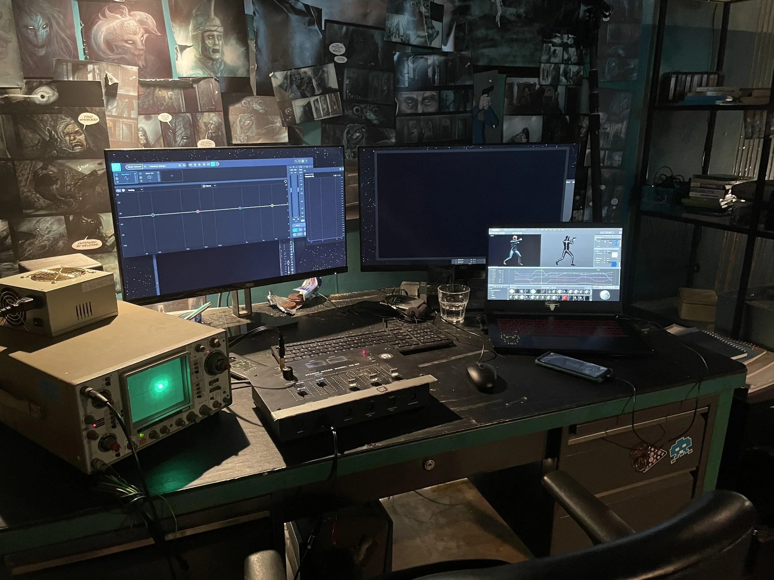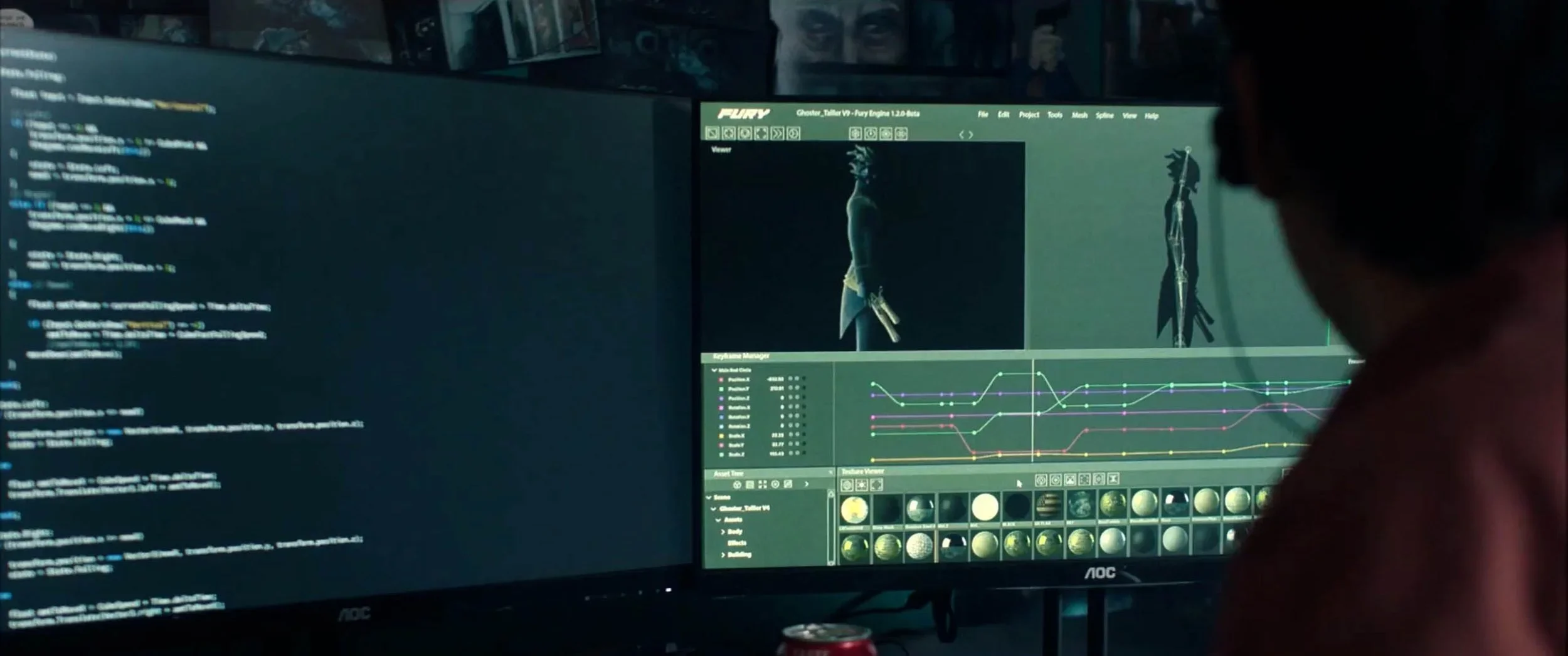 An on-set image of the Isaac’s desk, and the game he’s been developing call Ghoster. We designed the UI for the software, as well as setting up rough scenes for Ghoster and its characters.