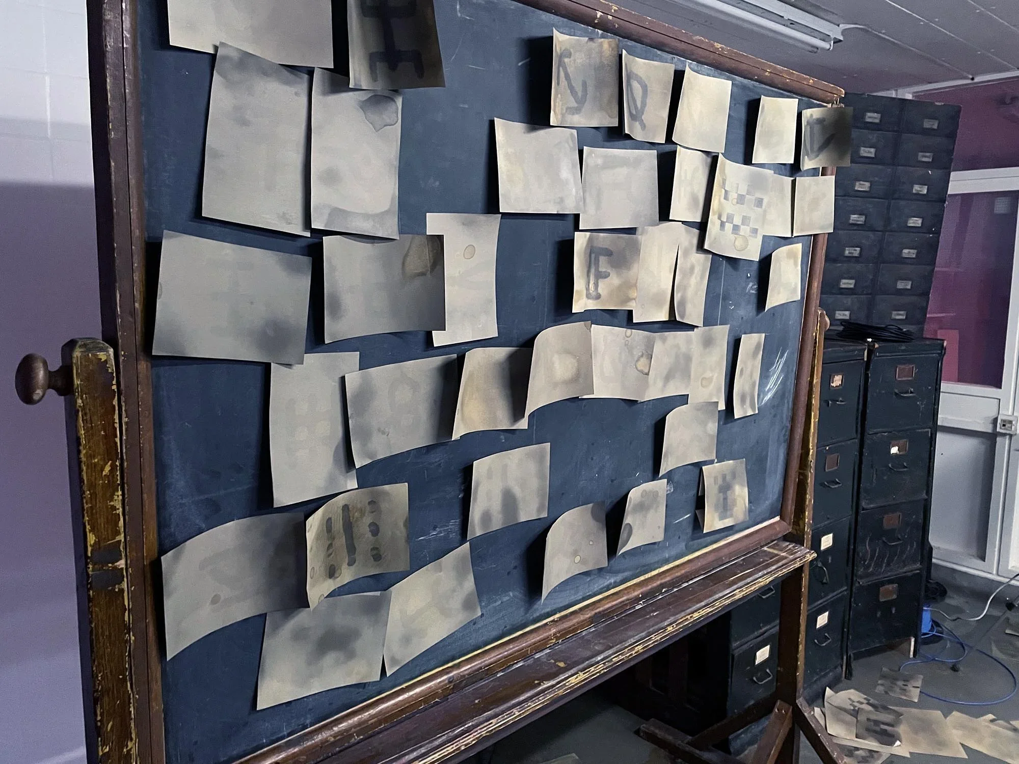An on-set image of the “aged” black board behind Beck seen in the original 1980s VHS recording of them curse-code experiments, that Kayla and Isaac discover. The symbols (hard to see here, but more visible below) were also created by us, as the basis of the ancient curse, turned into game code by Beck and his company.
